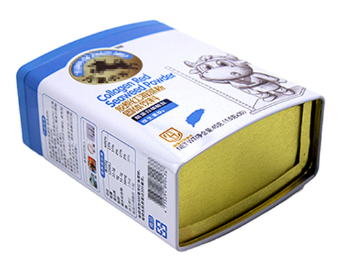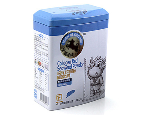 此款膠原紅海藻粉固體飲料鐵罐的尺寸為115*67*152mm,為了順應多樣化的市場包裝需求,這款茶葉馬口鐵罐可做成心形、正方形、橢圓形、車形、書本形等異形造型。