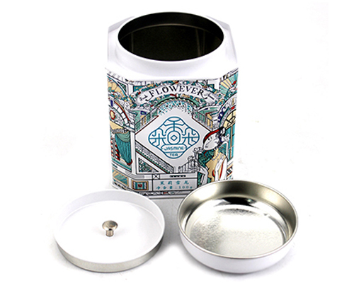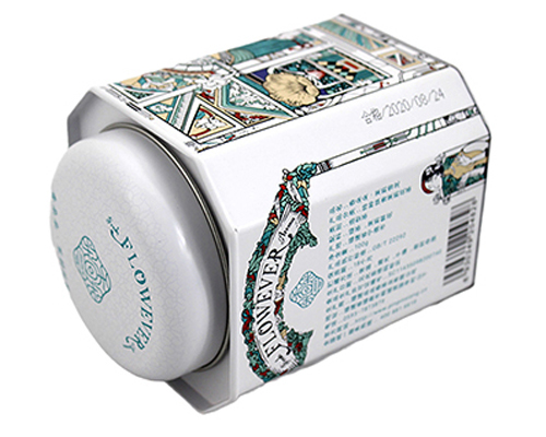 這款六角形白色通用茶葉罐鐵盒的尺寸為95*95*135mm,為了順應多樣化的市場包裝需求,這款茶葉馬口鐵盒可做成心形、正方形、橢圓形、車形、書本形等異形造型。