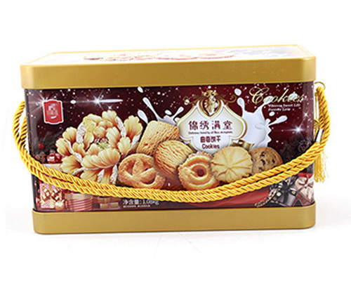 麥?zhǔn)瞎迾I(yè)生產(chǎn)的通用手提錦繡滿堂曲奇餅干鐵盒_馬口鐵食品鐵盒包裝,產(chǎn)品已遠(yuǎn)銷國內(nèi)外二十多個國家與地區(qū),食品鐵盒包裝生產(chǎn)廠家咨詢熱線:18676322818。